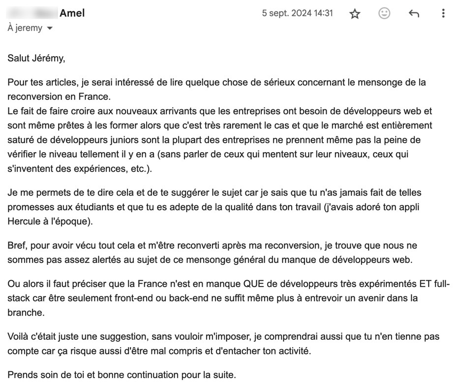 Donc quand vous lisez sur le site web d'une école ou d'une formation un taux de reconversion de 98 % des étudiant·e·s dans le dev web, vous êtes en droit de vous dire que mensonge il y a.
