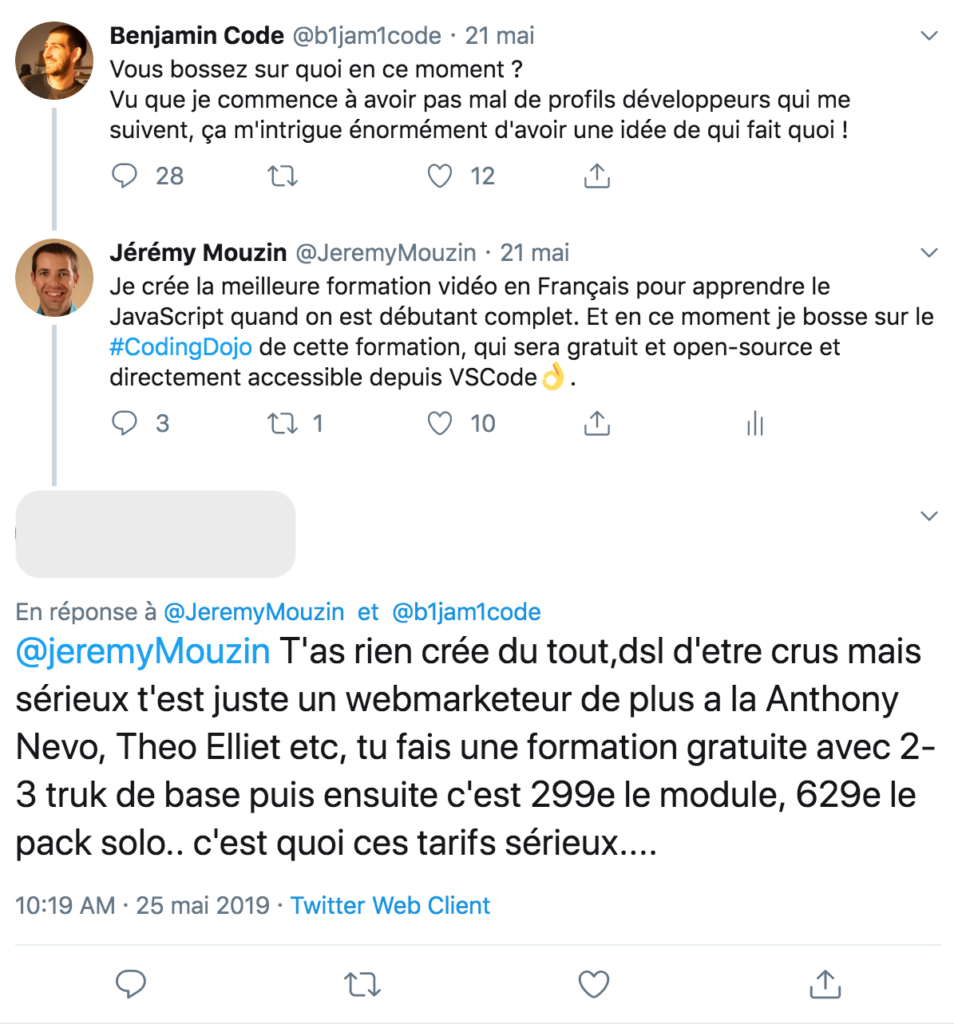 Ici, la frustration de cette personne, c’est le prix de ma formation JavaScript de Zéro.